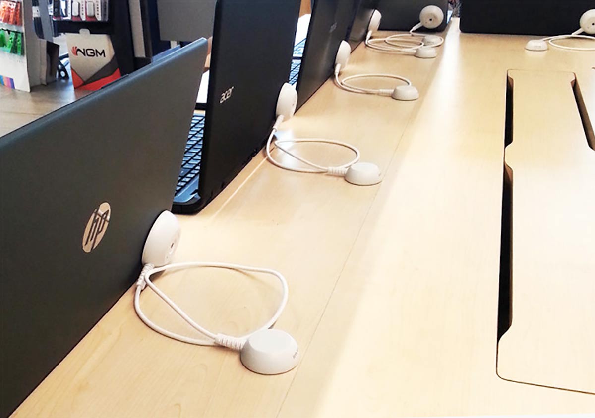Deliver a seamless, natural customer interaction with laptops on open display, supported by discreet alarm-on-product protection to deter theft. The system mounts securely to both flat and curved surfaces, ensuring flexible installation across any display table or environment.